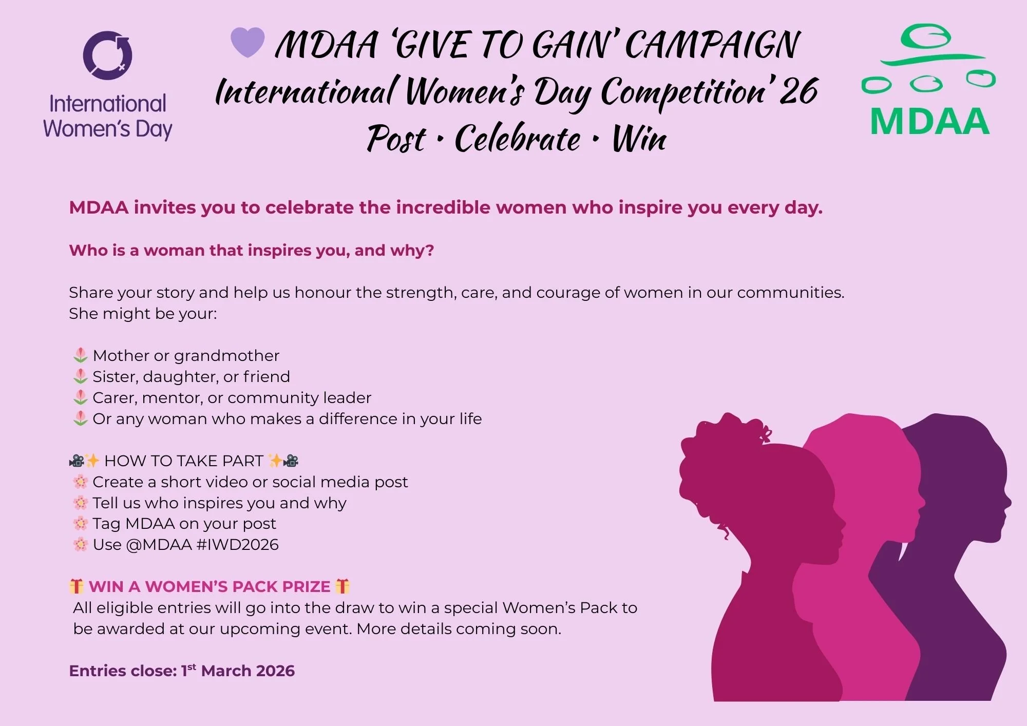 Entries must tag MDAA and use the campaign tags: @MDAA #IWD2026.